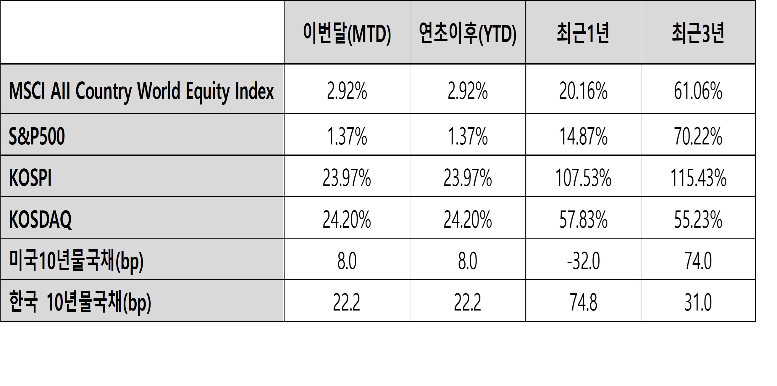 -성과요인: 미국 성장주의 횡보추세 속에서도 국내 가치주와 성장주의 강세가 지속됨에 따라 전반적 수익 증가 추세 지속됨 (연초 이후 수익률: 가치투자펀드 +27.27%, 성장주투자펀드 +58.63%). 이외 채권자산의 자본차손이 줄어들며 대체자산(리츠)에서의 성과개선 지속이 성과의 주요 플러스 요인으로 작용.
