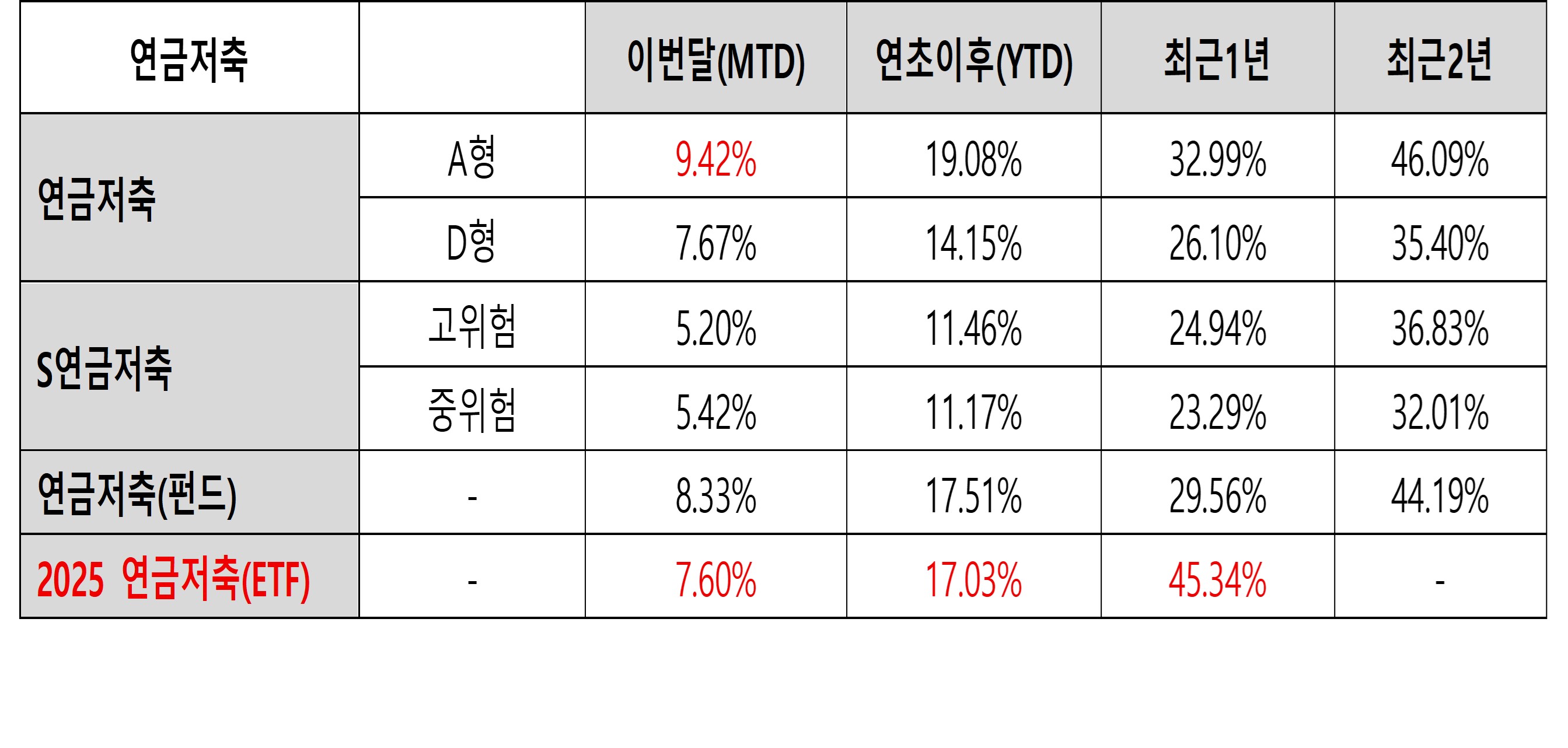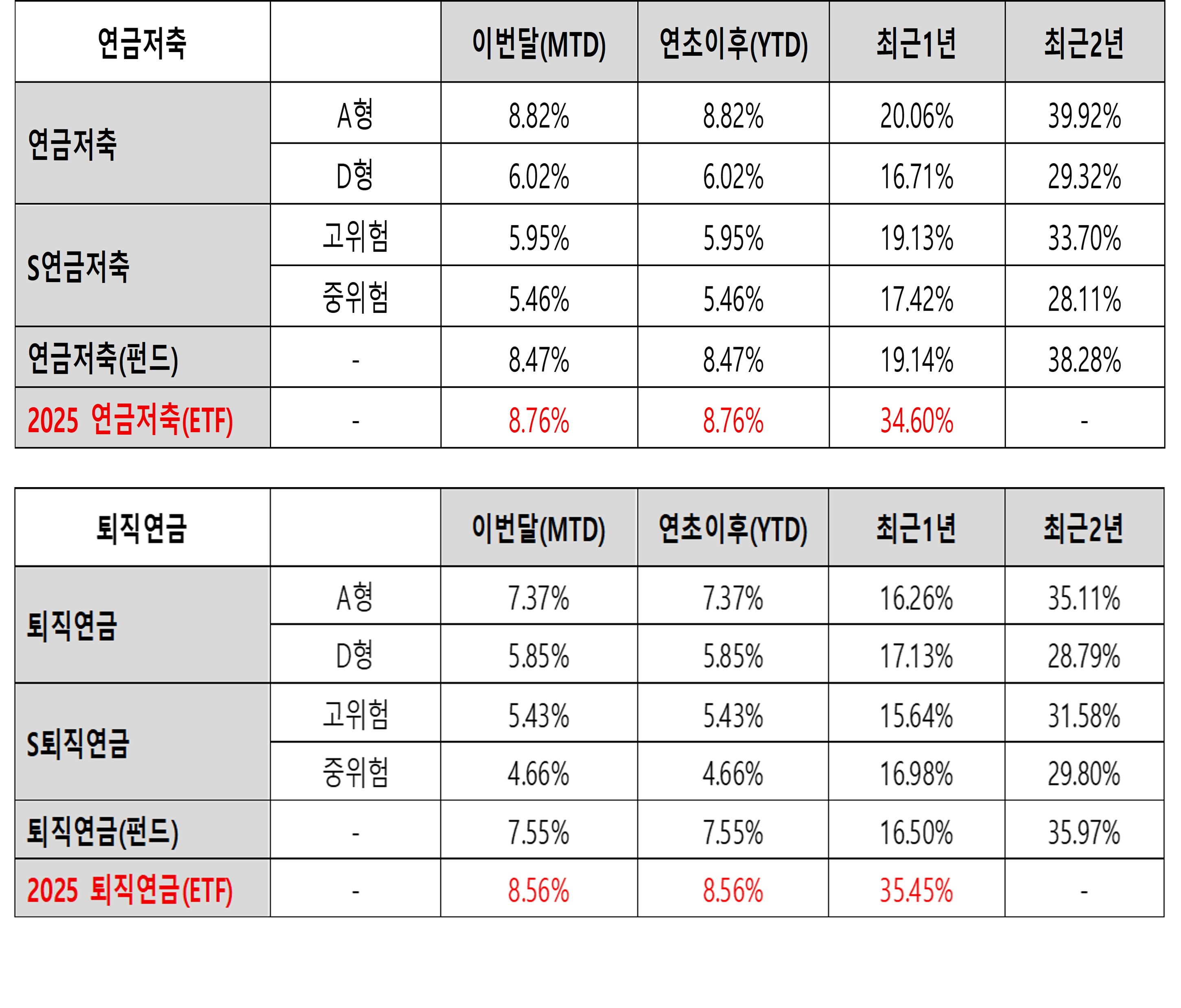 -부문내 최고 수익률(최근 1년 성과 기준): 전월에 이어 2025 연금저축ETF와 퇴직연금ETF가 부문내 최고 수익률 기록함. Core자산 중 국내 지수형의 차별적 성과 및 Satellite자산(AI, 조선 등 전략투자 자산)의 상승세 지속 및 신규편입 자산(국내 고배당ETF)이 차별적 성과를 시현.