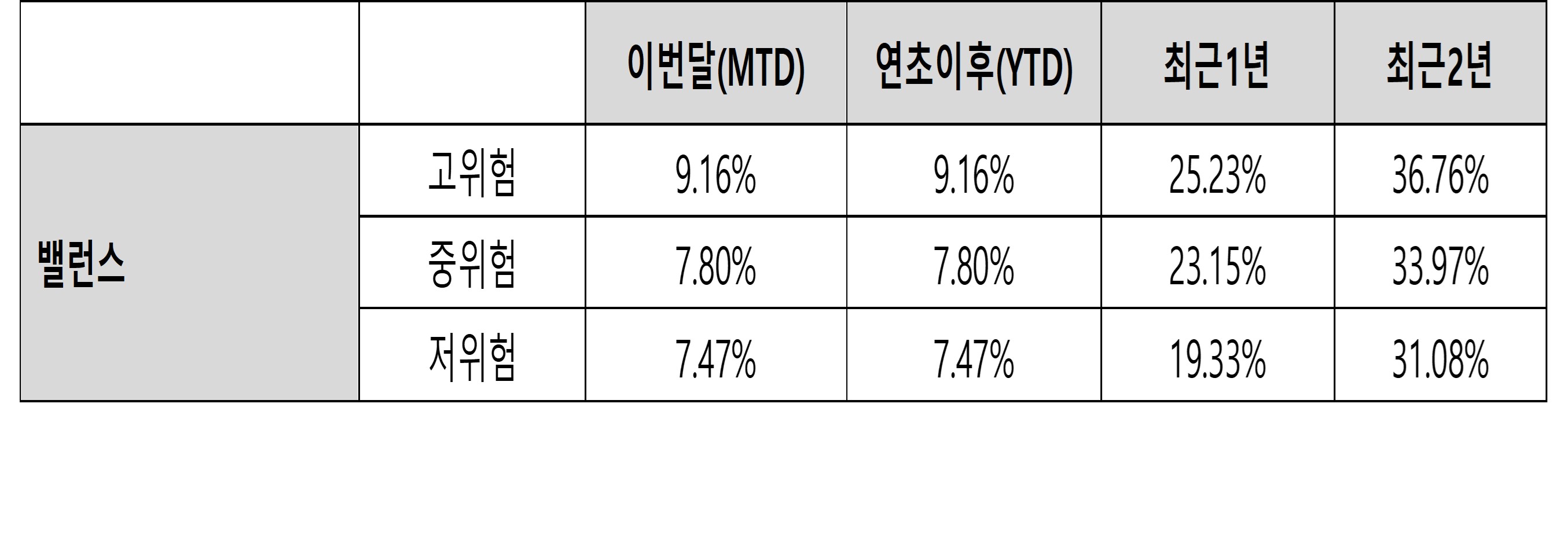 -성과요인: 최근 채권자산에서 발생한 자본차손을 국내 및 글로벌 주식의 상승으로 상쇄하고 추가적 수익 획득 국내주식의 강한 상승추세와 하이일드 채권과 리츠의 호조세가 성과의 주요 플러스 요인으로 작용.