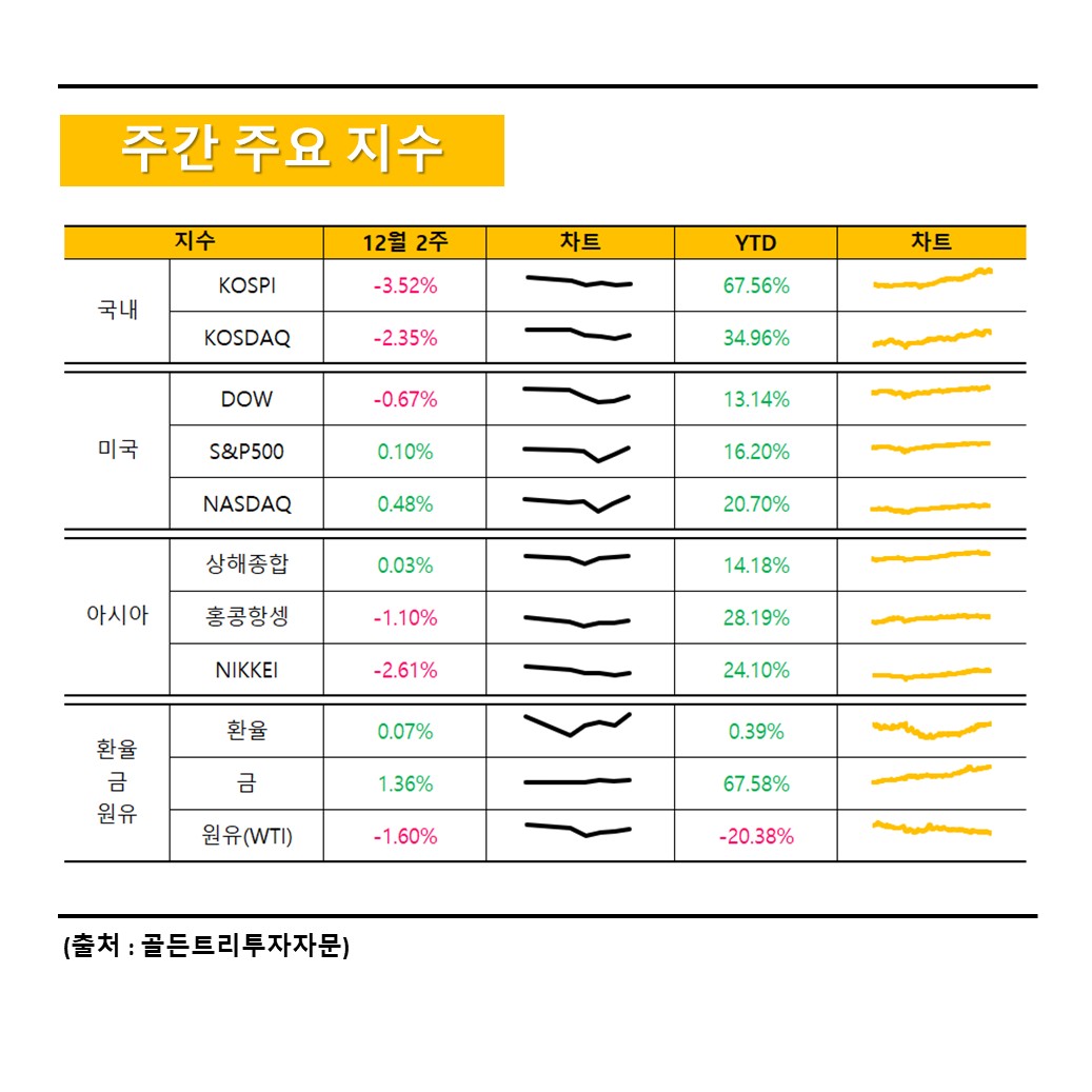 : 12월 셋째주 우리나라 시장은 KOSPI와 KOSDAQ 모두 조정을 받은 한주였습니다. KOSPI는 -3.52%, KOSDAQ은 -2.35% 하락했습니다.