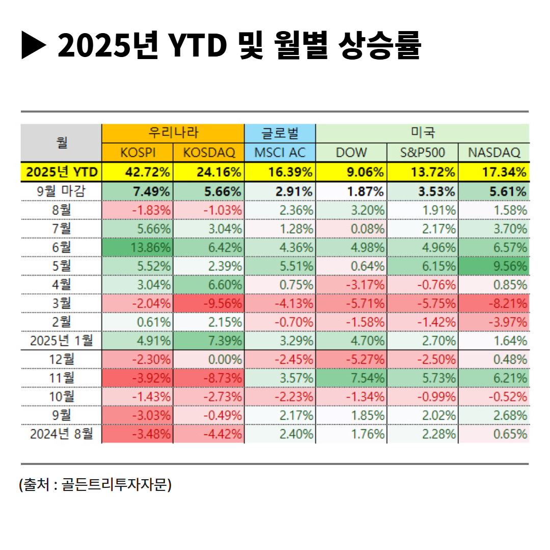 상대적으로 2020년 이후 약세를 보였던 9월(2020년 이후 평균 9월 -4.7% 하락)이었지만 이번에는 글로벌 증시 모두 골고루 상승했습니다.