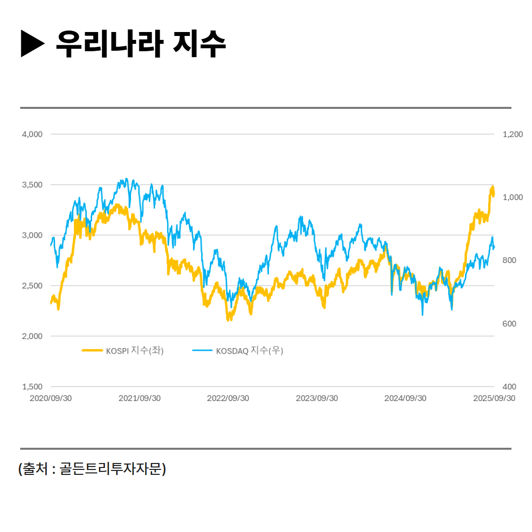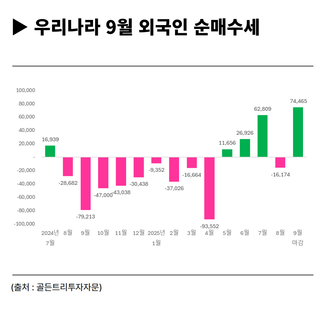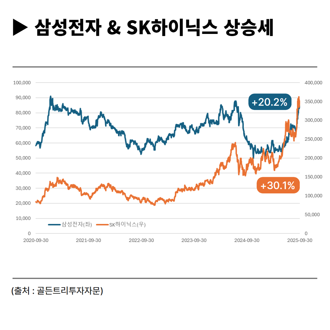 우리나라 시가총액 1, 2위 종목인 삼성전자와 SK하이닉스에 매수세가 집중되며 9월에만 각각 삼성전자 +20.2%, SK하이닉스 +30.1% 상승했습니다.