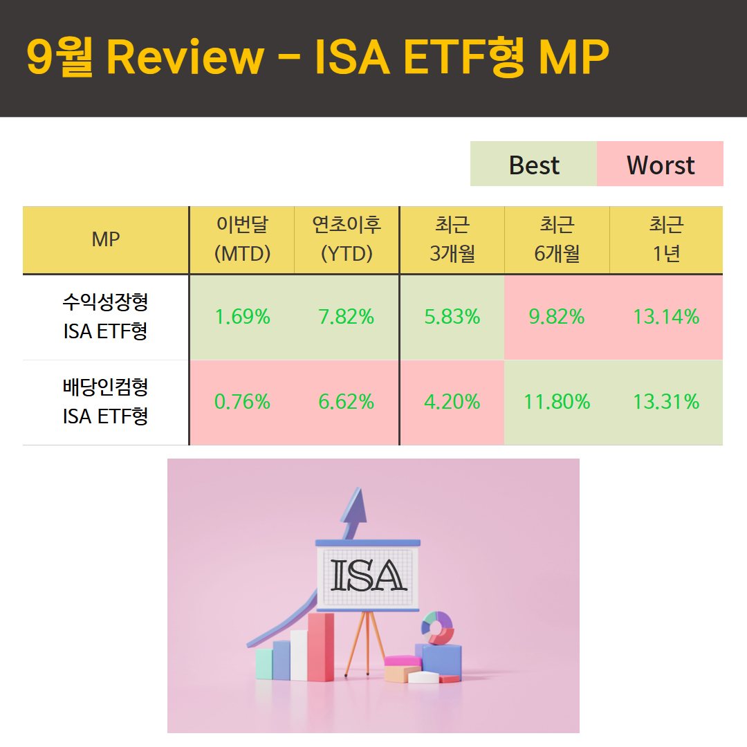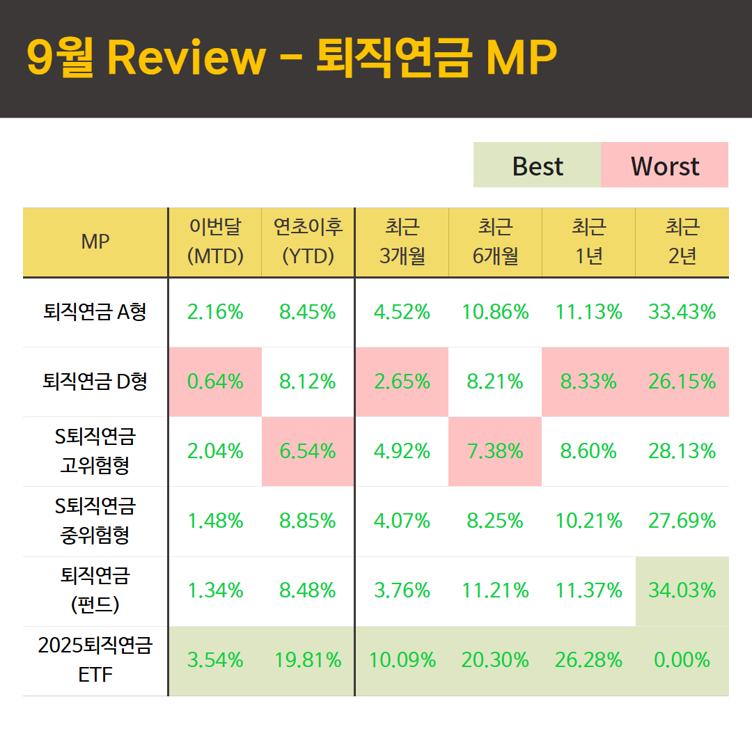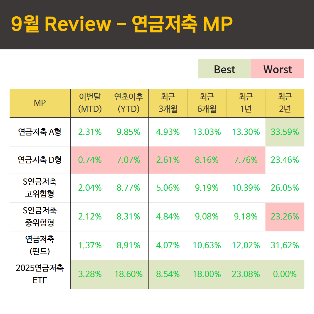 연금저축과 퇴직연금 MP에서는 성장주와 배당주 모두 강세를 보이며 에셋플러스글로벌리치투게더 펀드가 +5.94%, 베어링고배당 펀드가 +6.17% 상승했고, 주식혼합형인 신한마음편한TDF2050 펀드도 +3.22%를 기록했습니다.