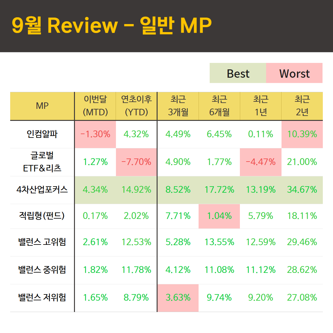 일반 MP 내에서는 위 삼성전자 상승에 발맞춰 삼성글로벌반도체 펀드가 +8.22%, 피델리티글로벌테크놀로지 펀드가 +4.69%를 기록했고, 우리나라 4차산업 전반에 투자하는 한국투자다시성장코리아 펀드도 +6.88%를 기록했습니다.