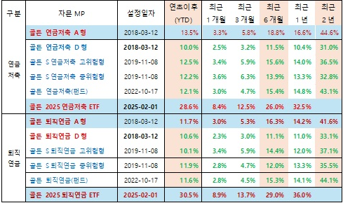 골든2025연금저축ETF, 골든퇴직연금A형 등 연금부문 대표 상품의 수익률은 각각의 편입자산