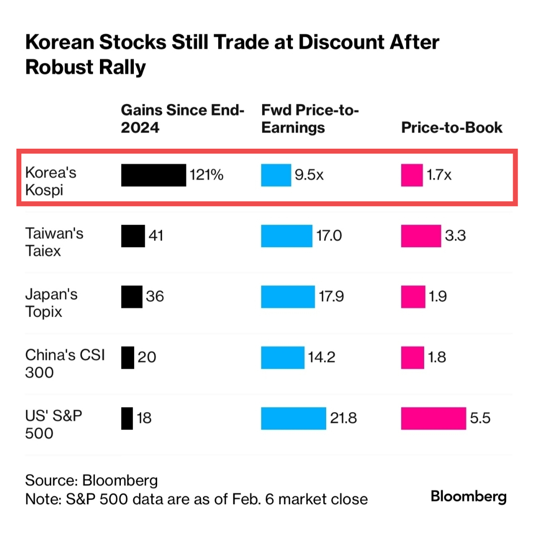 블룸버그는 2026년 2월 6일 우리나라 주식시장의 상승을 'Robust Rally'라고 평가하며 현재의 PER과 PBR을 다른 아시아 국가와 비교한 자료를 보도했습니다.