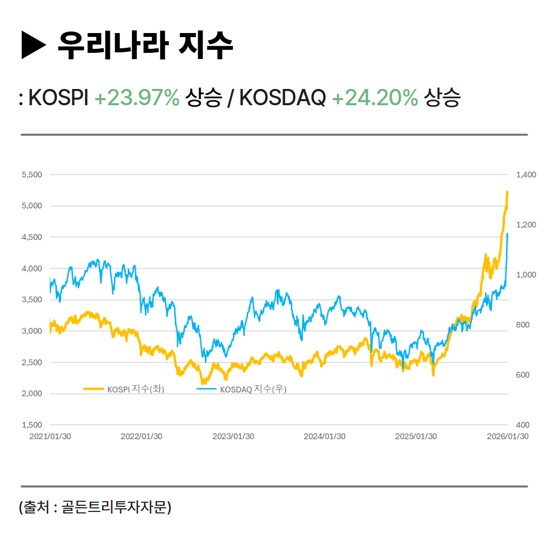 우리나라 KOSPI지수는 1월 +23.97% 상승했고, KOSDAQ지수는 +24.20% 상승했습니다.