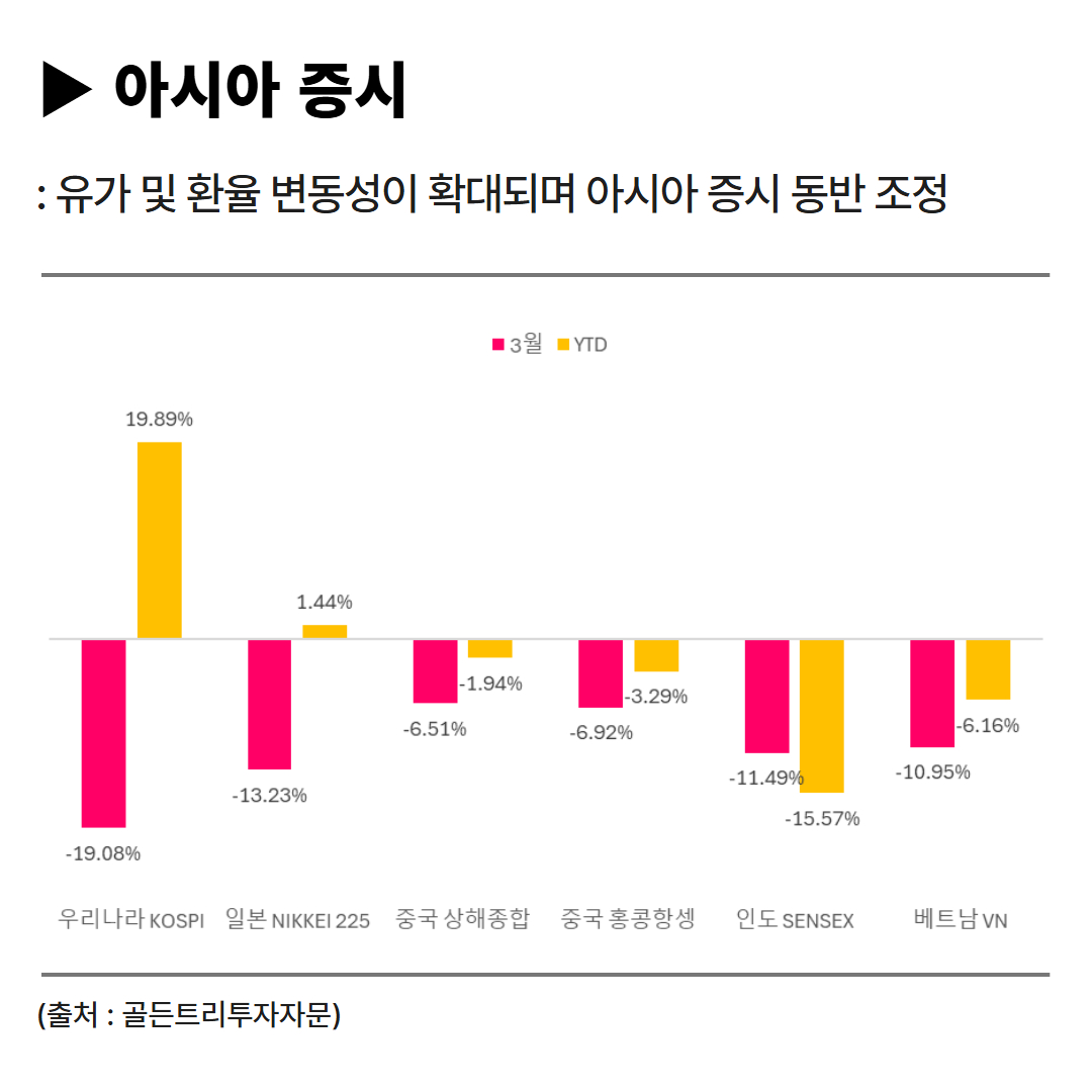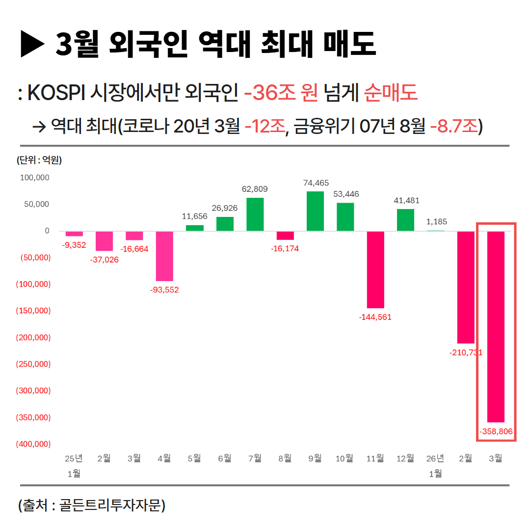 3월 중동 전쟁 영향으로 세계 증시가 하락한 가운데 외국인 매도세가 컸던 우리나라는 특히 크게 하락했습니다.
