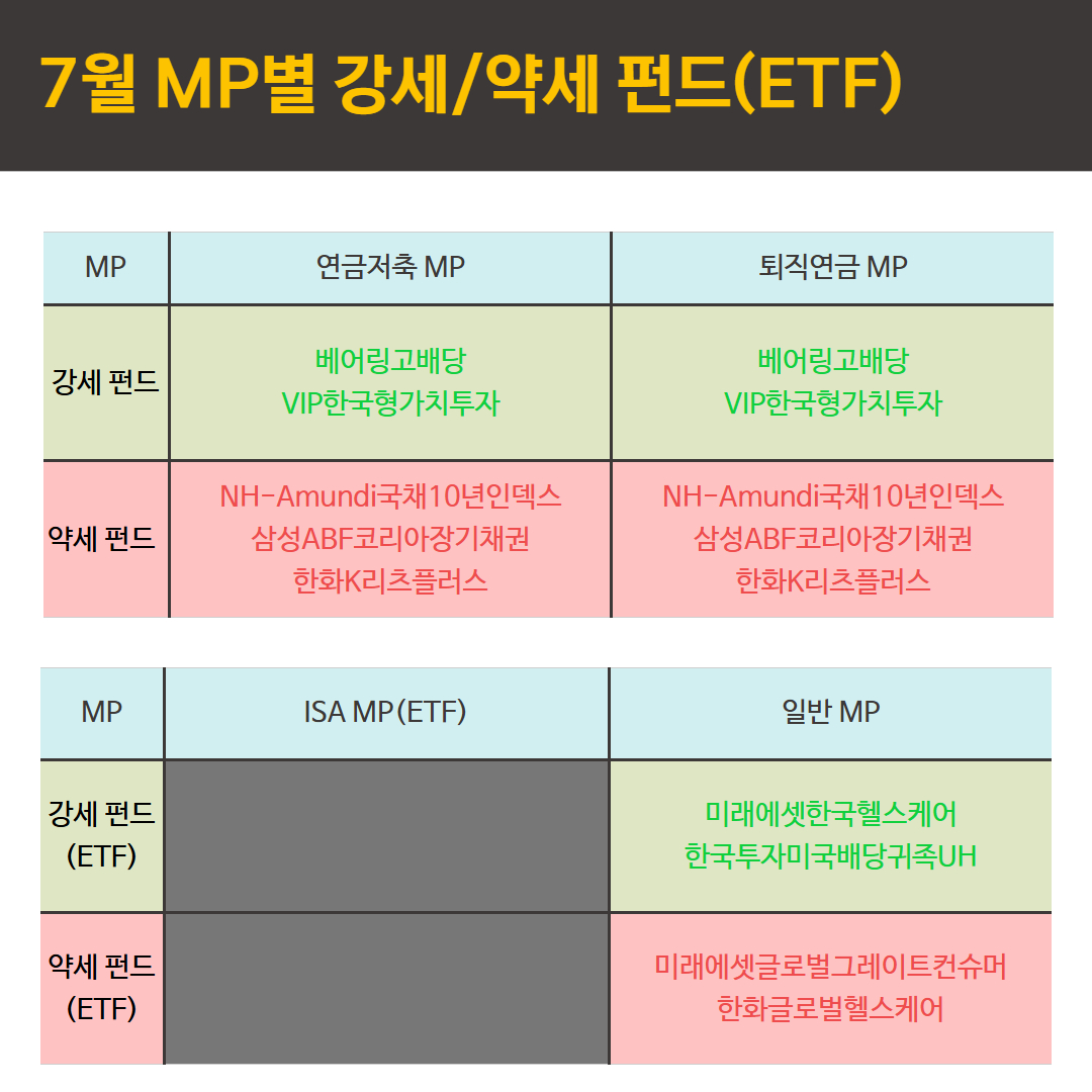 퇴직연금 MP 내에서 우수한 성과를 보였습니다. 일반투자 MP에서는 국내에 투자하는 미래에셋한국헬스케어 펀드가 +10.68%, 한국투자미국배당귀족UH 펀드가 +5.30% 상승했습니다.