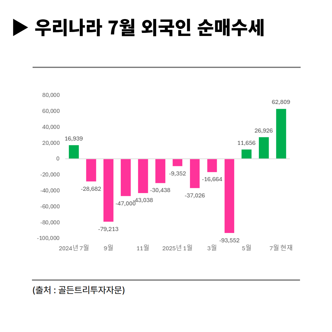 7월 상승은 외국인 순매수세에 기인했습니다. 5월부터 순매수세를 유지하고 있는 외국인은 7월 KOSPI 시장에서만 6조원 넘게 매수하며 시장을 주도했습니다.