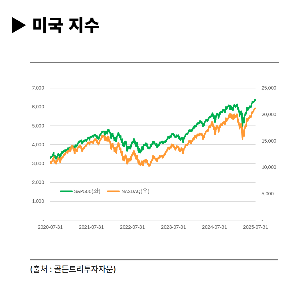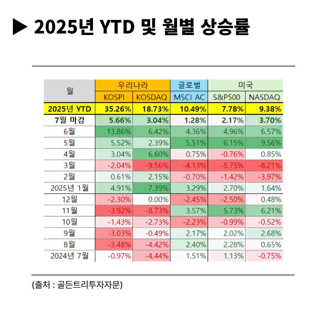2025년 YTD와 월별 상승률을 살펴보면 미국 S&P500지수는 7월 +2.17% 상승하며 2025년 YTD로 +7.78%를 기록 중이고, NASDAQ지수는 7월 +3.70% 상승해 YTD로 +9.38%를 기록 중입니다.