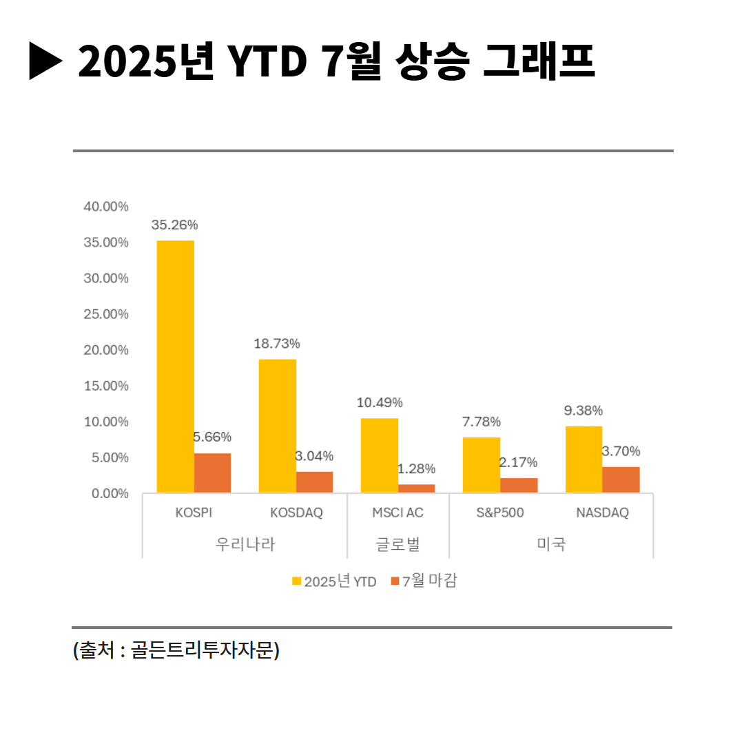 우리나라 중심으로 큰 폭의 상승세를 기록한 7월입니다. 상법개정안, 새정부 기대감 등으로 반등한 KOSPI는 4월부터 4개월 연속 상승세를 기록했습니다. 미국의 관세 협상 이슈가 지속적으로 시장에 악영향을 제공했음에도 불구하고 7월에도 KOSPI 기준 +5.66%, KOSDAQ 기준 +3.04% 상승했습니다.
