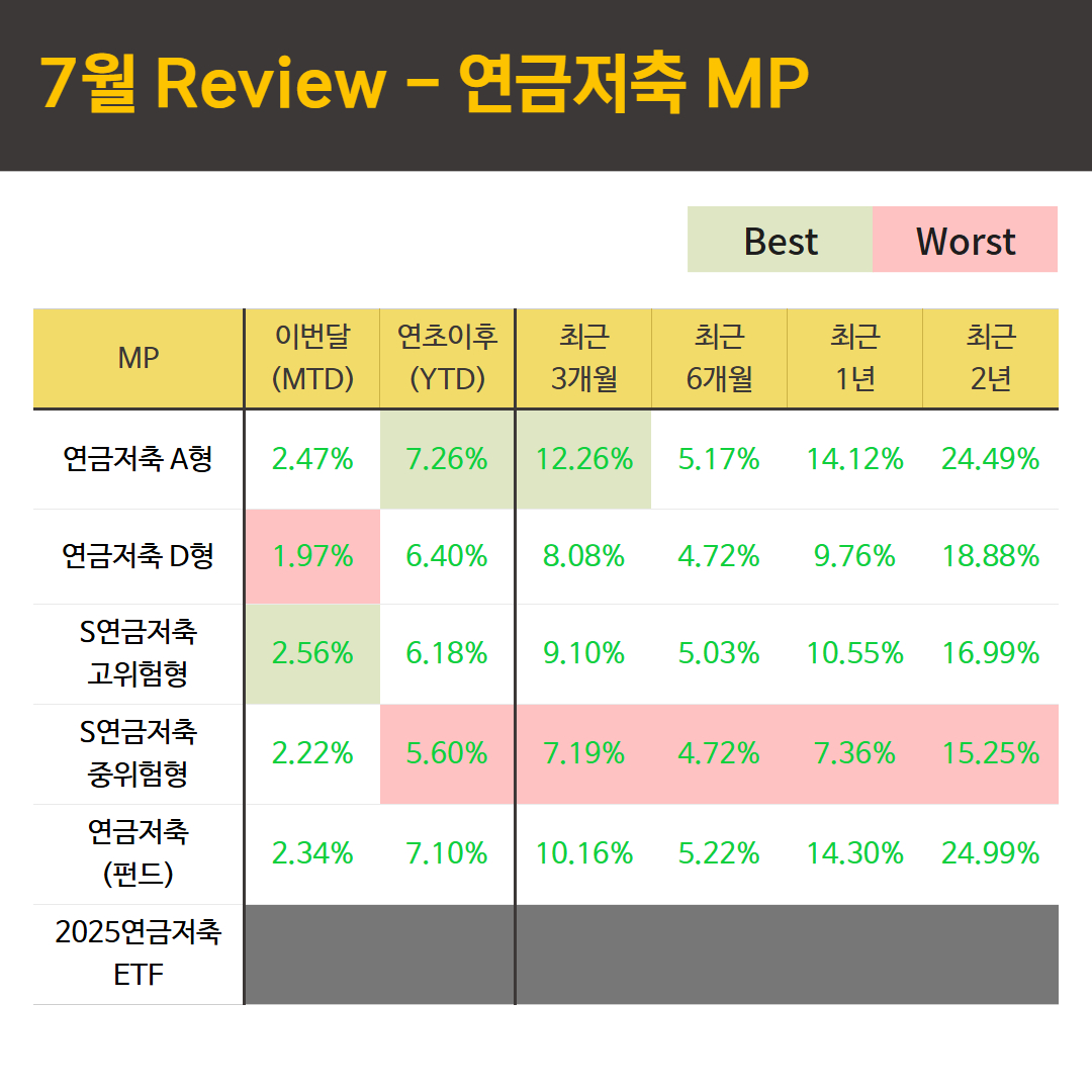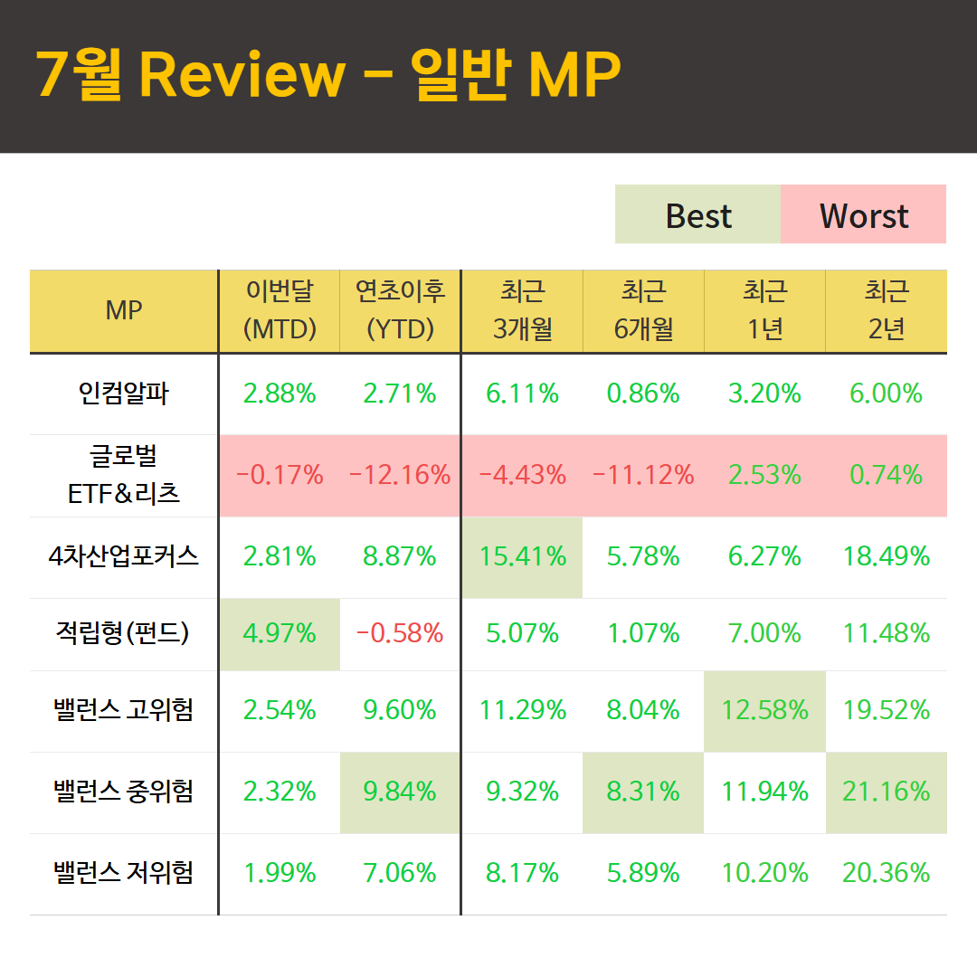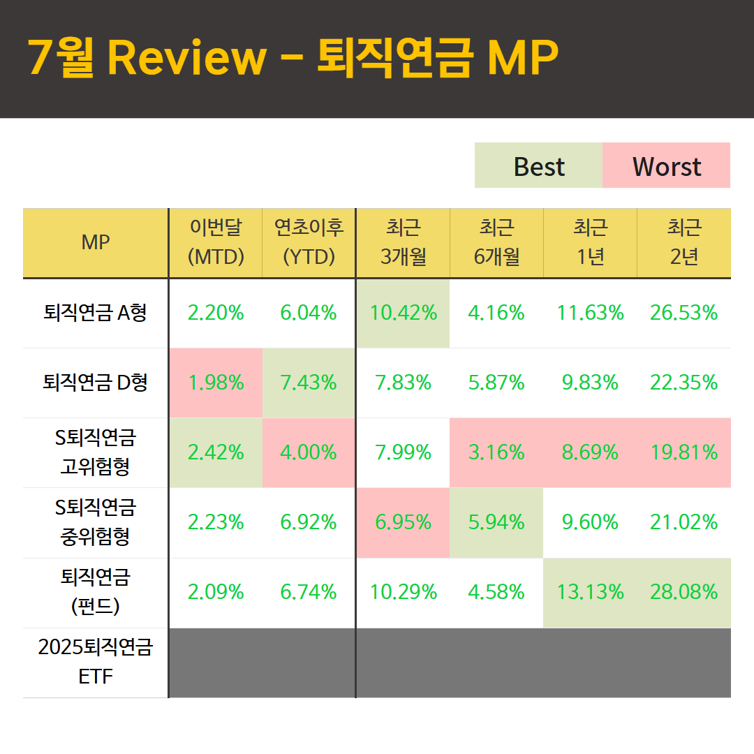 반면 7/30 미국이 금리를 동결하고, 관세로 인한 인플레이션 우려가 제기되면서 채권형 펀드는 플러스이긴 했지만 약세를 보였습니다. 연금저축/퇴직연금 MP에서 NH-Amundi국채10년인덱스 펀드가 +0.08%, 삼성ABF코리아장기채권 펀드가 +0.23%를 기록했습니다. 일반투자 MP에서도 미래에셋글로벌그레이트컨슈머 펀드가 -1.91%, 한화글로벌헬스케어