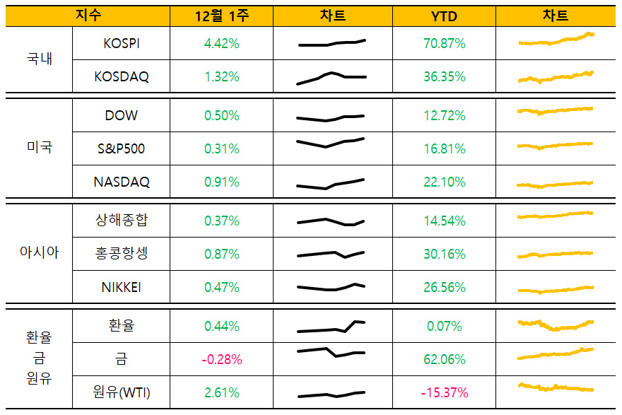 : 11월 글로벌 증시 모두 조정을 받은 가운데 12월 첫째주는 KOSPI 중심으로 상승했습니다. 지배구조 개편 등의 기대감에 따라 삼성전자, LG에너지솔루션, 현대차 등 시가총액 상위 종목들이 지수 상승을 견인했고, 특히 현대차는 역사상 최고치를 경신했습니다.