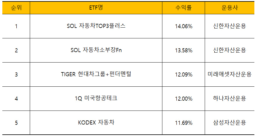 : 현대차가 역사상 최고치를 경신함에 따라 자동차업종에 투자하는 ETF의 수익률이 상위를 석권했습니다. SOL 자동차TOP3플러스가 14.06%를 기록하며 주간수익률 1위를 기록했고, 5위 중 4개의 ETF가 모두 자동차업종 ETF였습니다.