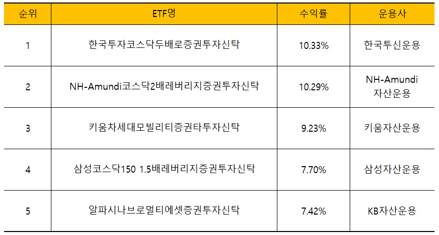 그 여파가 이어지며 KOSDAQ 레버리지 펀드들이 수익률 상위 펀드에 다수 포진했습니다.