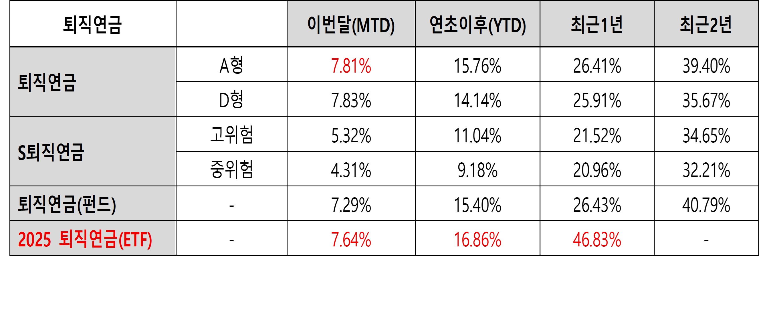 -부문내 최고 수익률(최근 1년 성과 기준): 전월에 이어 2025 연금저축ETF와 퇴직연금ETF가 부문내 최고 수익률 기록함. Core자산 중 국내 지수형의 차별적 성과 및