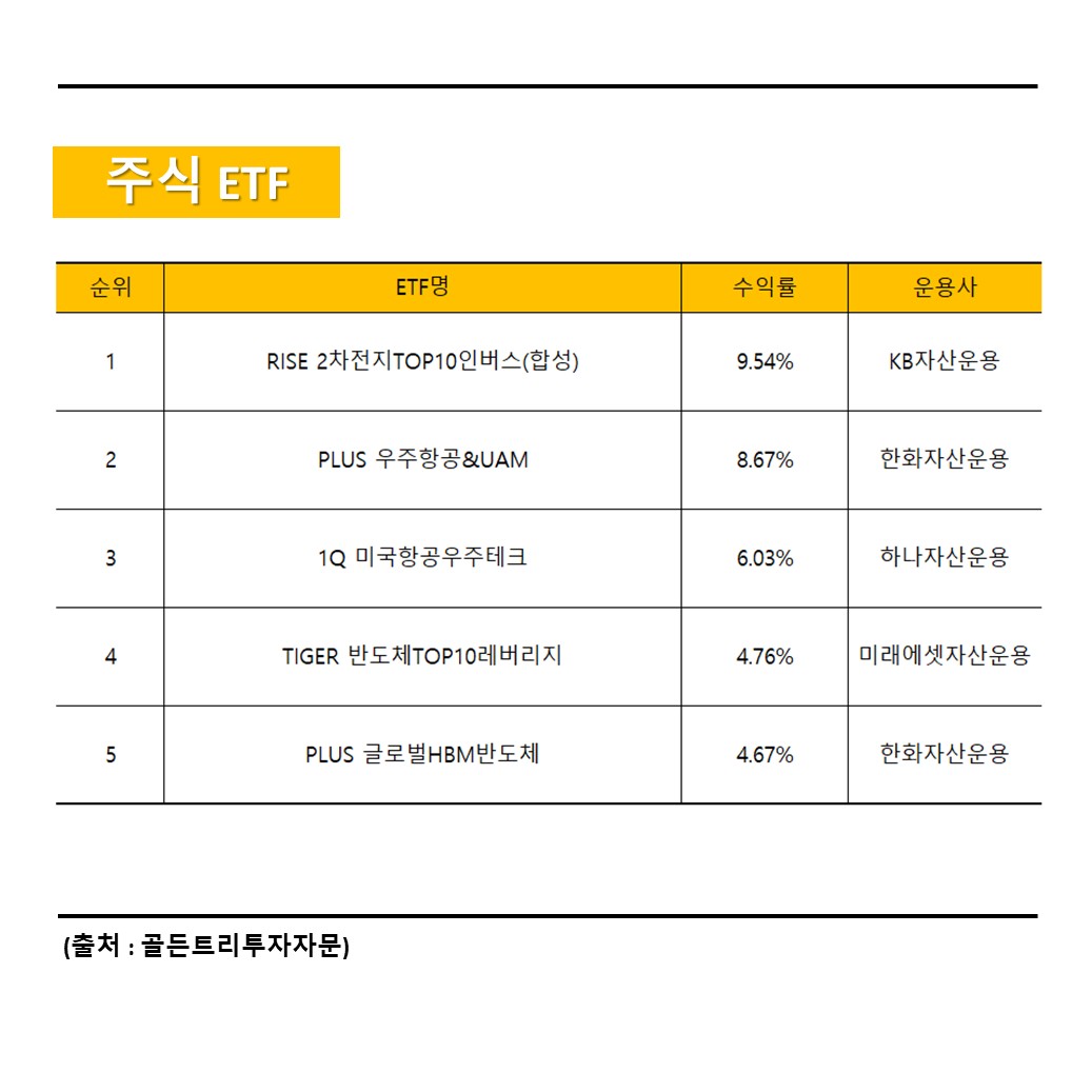 기록했습니다. 2~3위는 지난주와 마찬가지로 우주항공 섹터의 ETF가