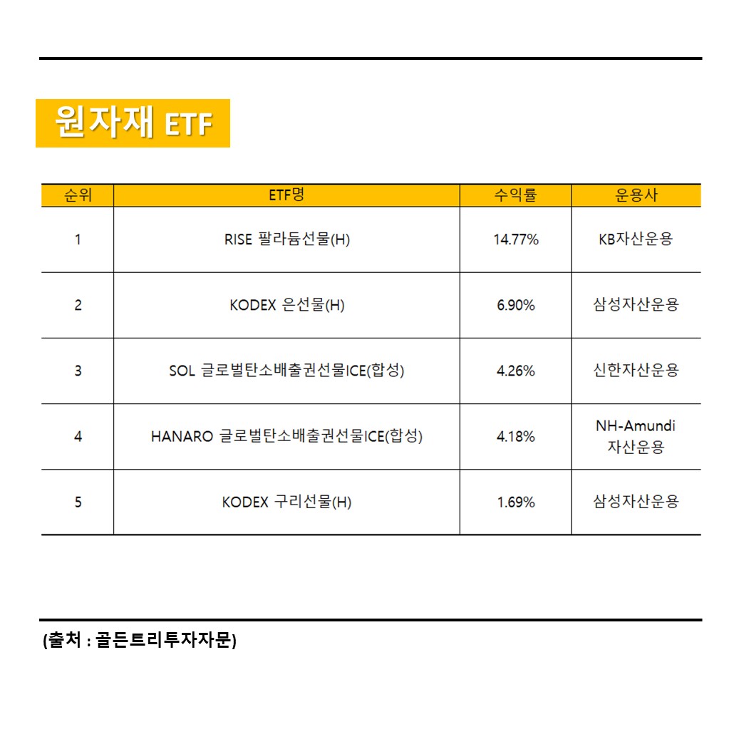 : 1위는 팔라듐 ETF인 RISE 팔라듐선물이 +14.77%를 기록했고, 2위는 3주 동안 연속 상승하고 있는 KODEX 은선물이 +6.90%를 기록했습니다. 3위와 4위는 글로벌탄소배출권 관련 ETF였습니다.