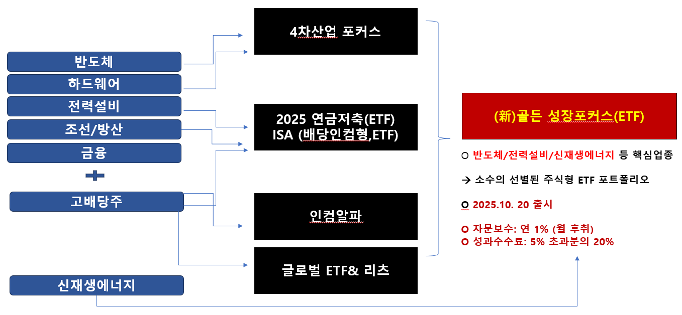 AI산업의 밸류체인을 전략적으로 조합하여 포트폴리오를 구성한 골든성장포커스 ETF MP 등 골든트리투자자문의 통찰력이 담긴 자문형 상품에 관심과 성원을 부탁드립니다.