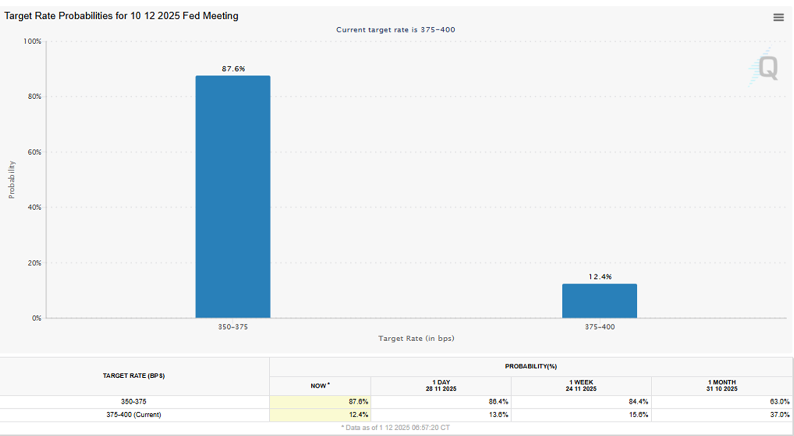 세계적 파생상품거래소 CME그룹의 FedWatch를 통해서 본 12월 미 연준 기준금리 인하 확률은 현재 87%를 넘고 있습니다.