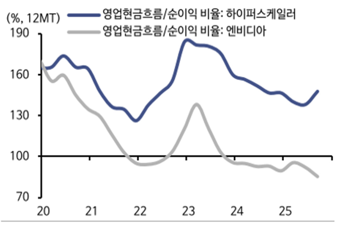 하지만 이들의 채권발행이 당시 회사채와 국채의 금리차이가 역대급으로 좁혀진 시기를 활용한 자본구조 최적화 관점의 선택이었고, 하이퍼스케일러들의 양호한 순이익 대비 영업현금흐름 비율에 의해 이익의 질에 대한 의구심도 상당히 불식시킬 수 있을 것입니다.