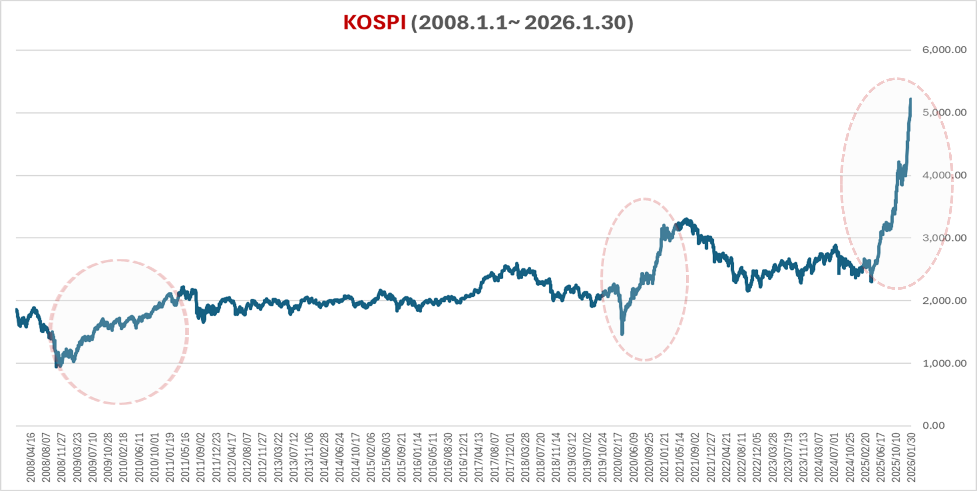 KOSPI는 ‘26년 1월 5000포인트를 돌파했습니다. 2008년 이후의 장기적 추세를 보면 세 번의 주요 상승국면이 있었는데, 금융위기 이후의 회복기간, 코로나 팬데믹 시기, 그리고 최근의 상승국면입니다. 이 중 가장 강력하고 큰 폭의 상승을 보여주고 있는 것이 바로 최근의 모습입니다.