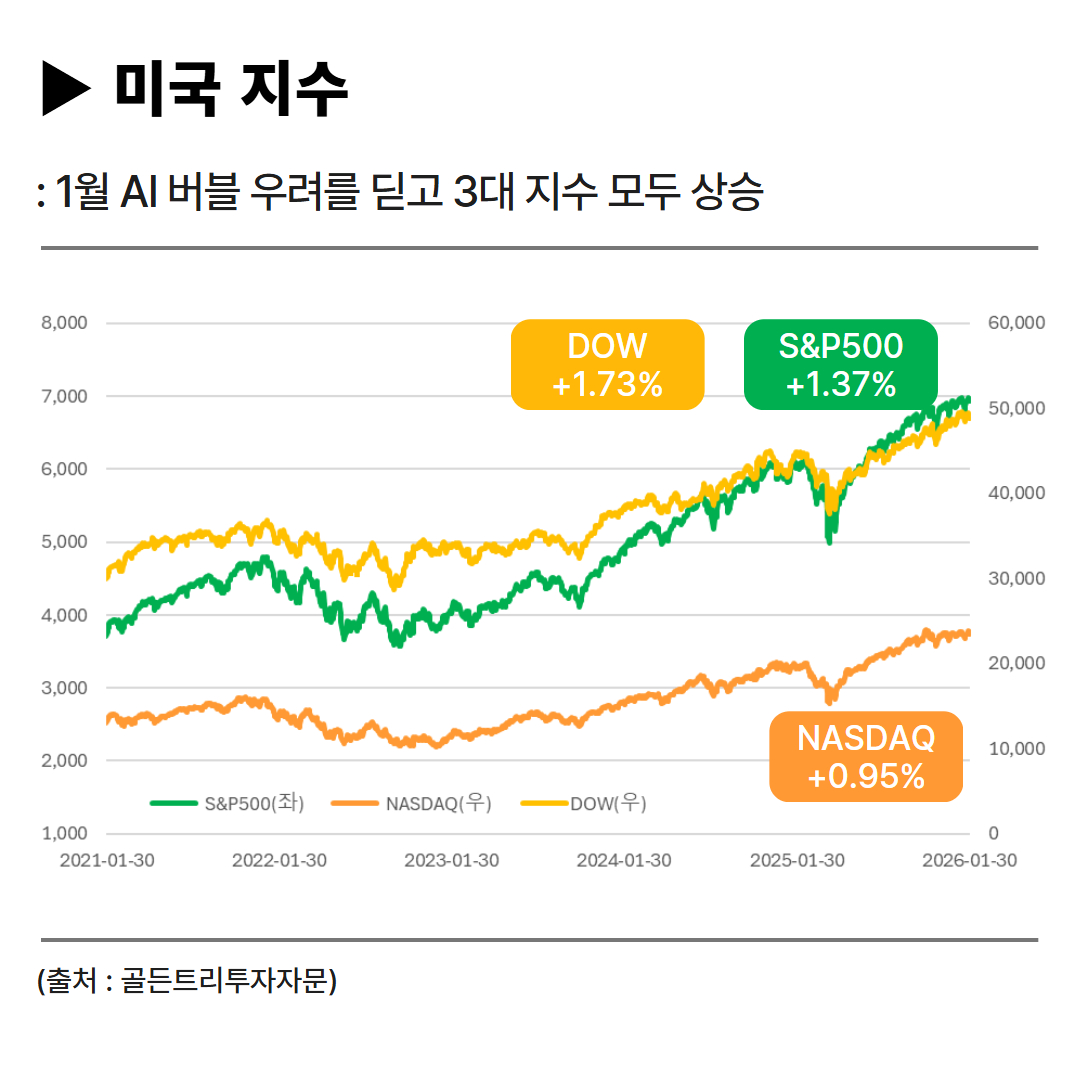 반면 미국 시장은 3대 지수 모드 상승했지만 AI 거품 우려가 계속 이어지며 소폭 상승에 그쳤습니다.