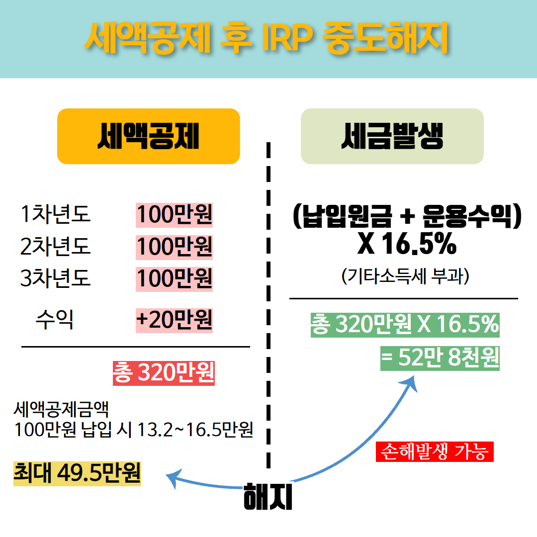 첫 번째 유형의 경우, 해지 시 그동안 받았던 세액공제 혜택을 전액 반납해야 하며, 계좌 내 전체 금액(납입 원금 +