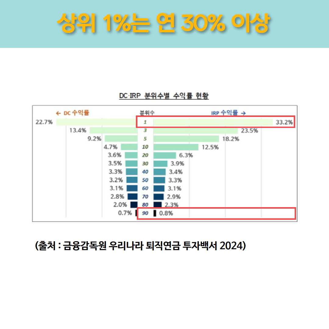 같은 제도를 활용하더라도 결과는 크게 다릅니다. IRP 수익률 상위 1% 계좌는 연 30% 이상의 수익을 기록한 반면, 하위 10%는 1%에도